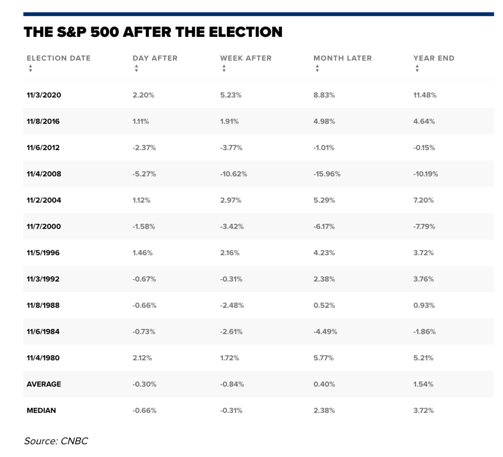 Först och främst analyserade CNBS´s Chris Hayes och Alex Harring hur S&P500 presterat efter varje val sedan 1980. De kom fram till följande: